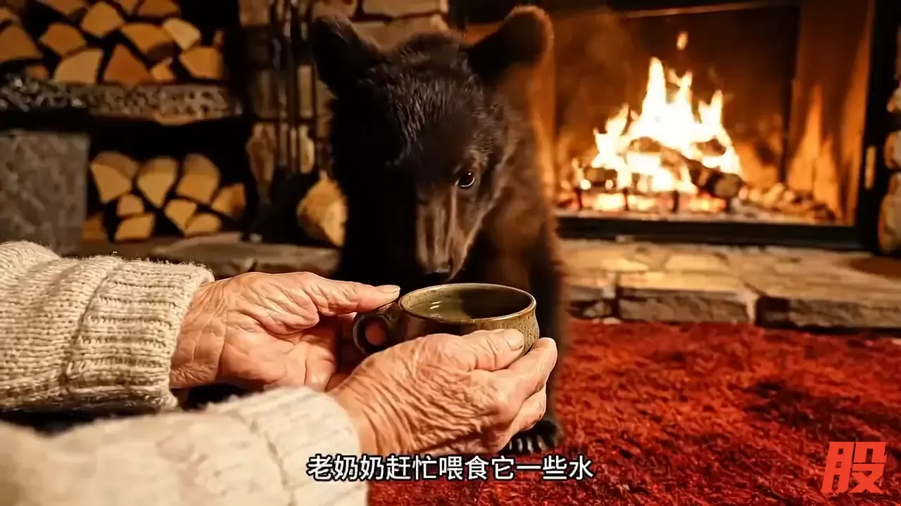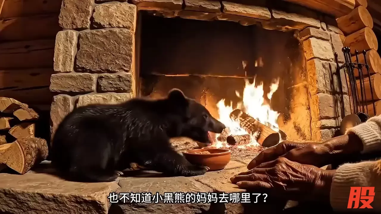 老奶奶打开房门发现一只小黑熊躺在那里,心疼的老奶奶立即把它带回家里。很快小黑熊就苏醒了,老奶奶赶忙喂食它一些水,接着再切一些肉喂食小黑熊。饥饿的它大口朵颐起来,这是它好几天吃过最好吃的食物。也不知道小黑熊的妈妈去哪里了?应该是给它觅食去了。小黑熊吃完躺在取暖炉旁美美的睡了一觉。