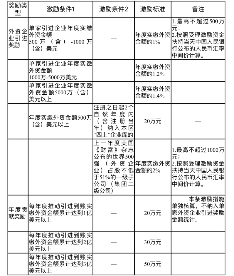 除基本引进奖励外,该政策还设置了年度贡献奖励。年度推动引进到账实缴外资金额累计达到1亿、2亿、3亿美元以上的金盛网,分别给予20万、30万、50万元奖励。此奖励单独核算,不纳入单家外资企业引进奖励统计。