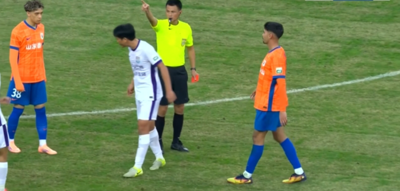 第87分钟,津门虎球员陈哲宣对裁判判罚不满,遭黄牌警告。随后他继续不满裁判向自己出示黄牌,李海新理解成他想要红牌,索性直接掏红牌将其罚下。